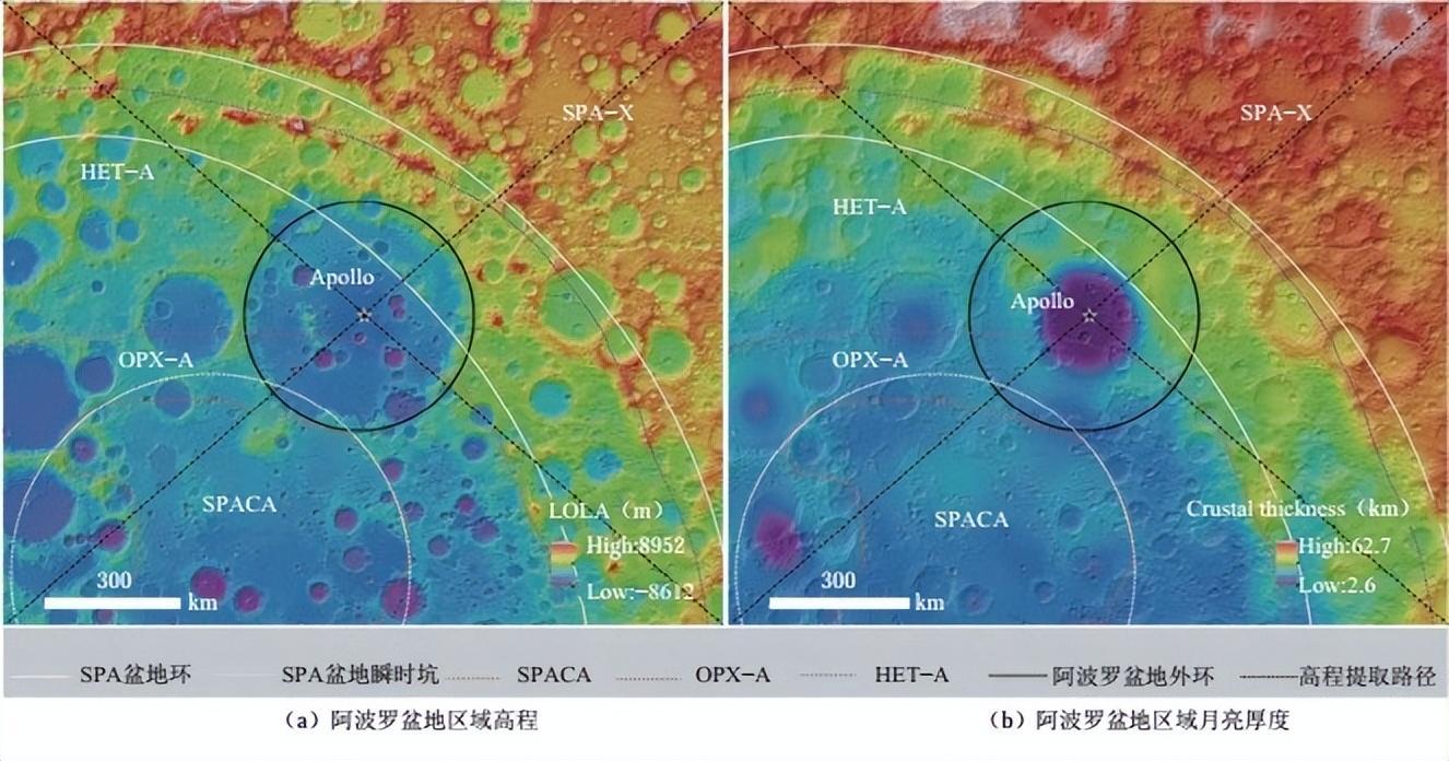 阿波羅盆地區域高程與月殼厚度。 圖片來源:參考文獻2