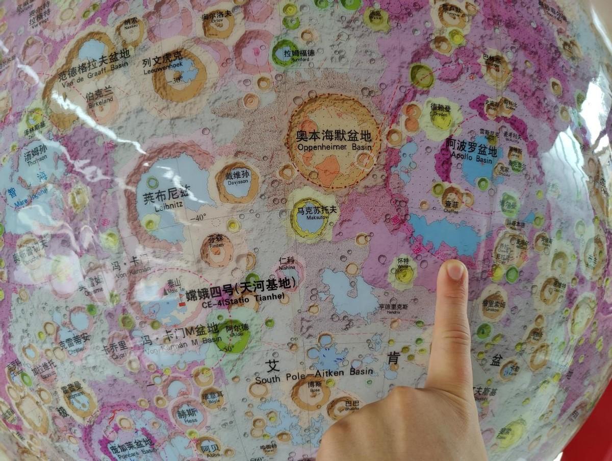月球儀上的阿波羅盆地,手指位置爲嫦娥六號預選着陸區附近。月球儀根據中國科學院地球化學研究所等單位 聯合繪製的1:250萬月球地質圖製作,直徑約1.55米。