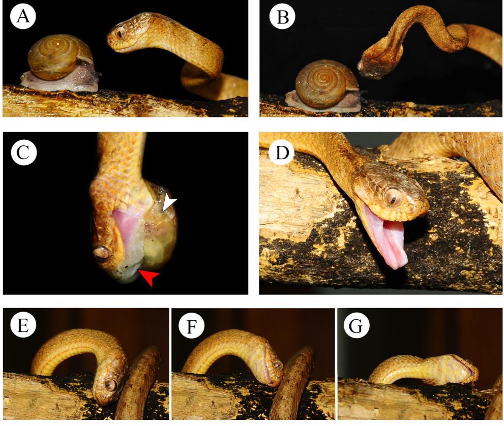 除了鈍頭蛇,科學家們在另一類食螺蛇科的蛇類身上也發現了發達的下脣腺。顧名思義,食螺蛇和鈍頭蛇一樣,也存在捕食軟體動物的行爲。