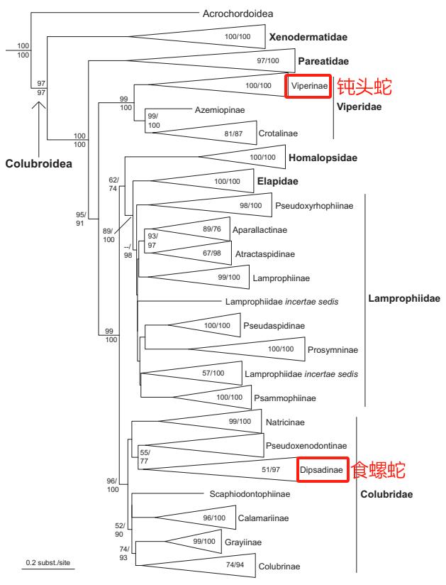 兩種蛇在系統發育樹上的位置差遠了,八竿子打不着那種 (圖片來源:參考資料6)
