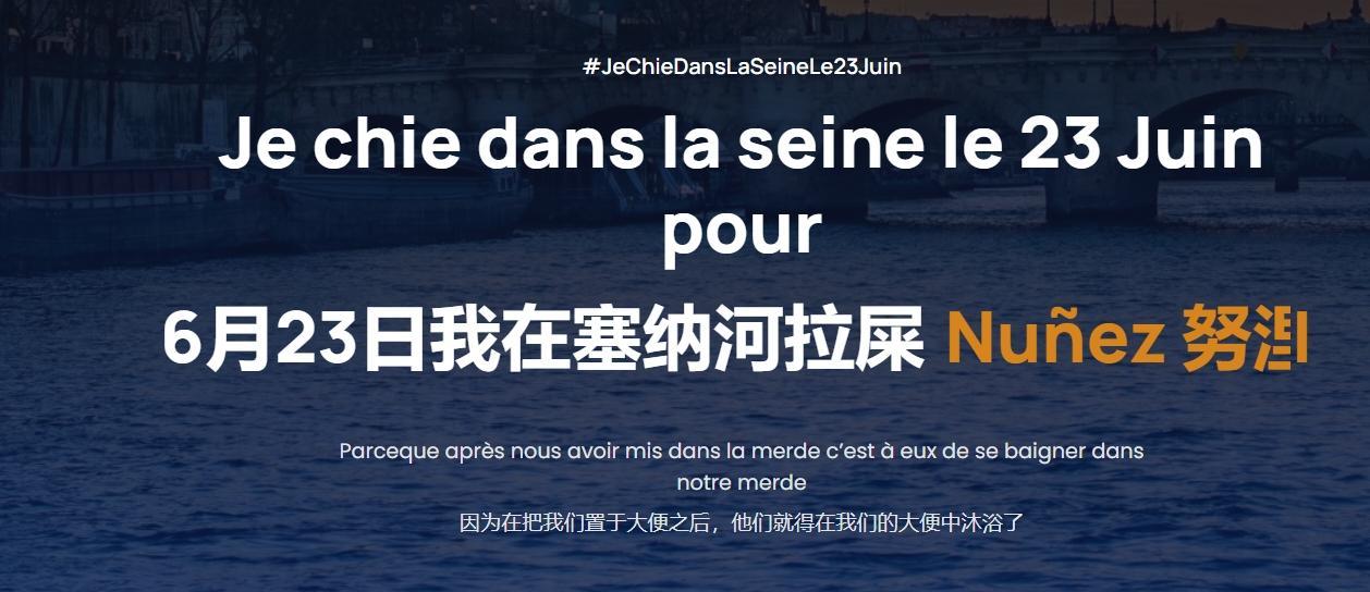 我也不知道這個活動是誰發起的,但是搞得有模有樣的,有一個專門的網站,上面還有距離在塞納河拉粑粑的倒計時,時間精確到秒,標語是:因爲把我們置於粑粑之後,他們就得在我們的粑粑中沐浴了,這個說的是政府把錢花在了治理塞納河的糞便以及垃圾上,不顧民生。