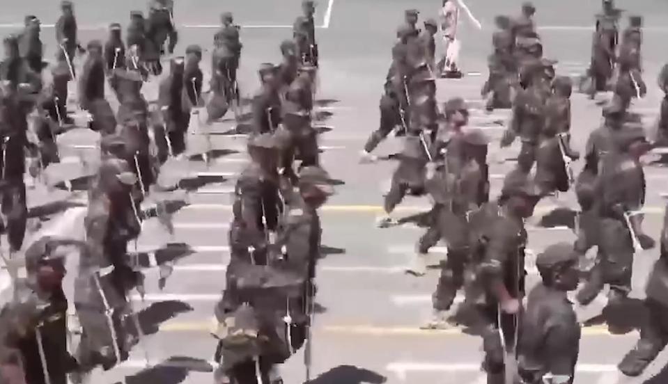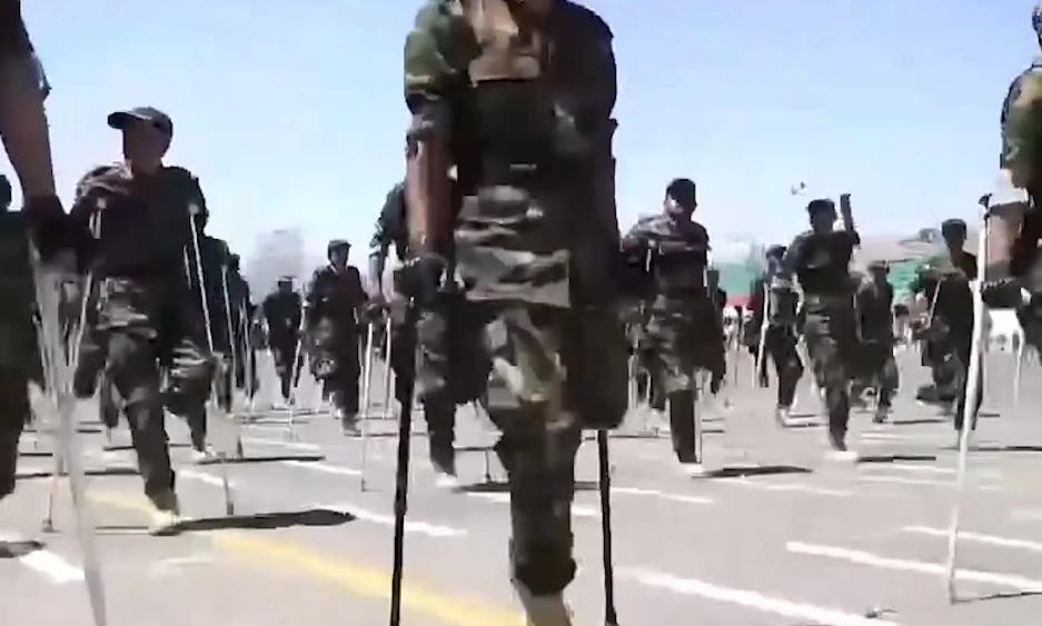 竟然是殘疾軍人方隊,缺腿拄着雙柺,重傷難行走的坐着電輪椅,空袖筒舉軍禮,他們全部有序前進,缺乏整齊的步伐,但是卻最震撼人心的閱兵,軍魂比數量更重要!見識了胡賽武裝軍人的風骨,他們的武器裝備不能不提,