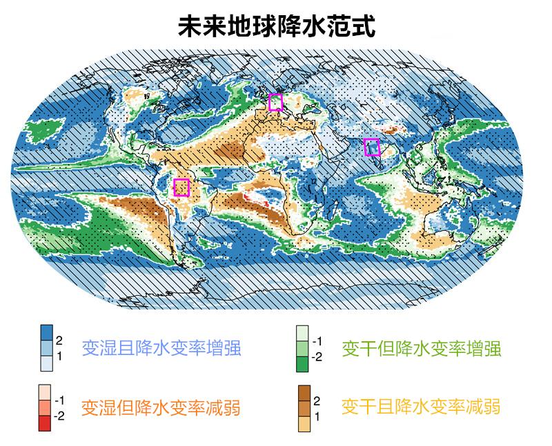該研究指出,在未來全球變暖的背景下,大氣水汽含量增加,有更多的水汽可以支撐極端降水的發生,因而降水的變率將會增強;與此同時,水汽和環流之間的相互作用也會加強降水變率,例如,更多的水汽在凝結時將釋放更多的潛熱,這些能量將進一步加強上升運動,在這種正反饋機制下,降水變率進一步增強。如果我們僅僅考慮水汽的變化,未來降水變率將在全球較爲均勻地增強,但由於增暖背景下大氣環流的變率將減弱,在水汽和環流的共同影響下,最終全球降水將呈現如上圖所示的4種變化型。