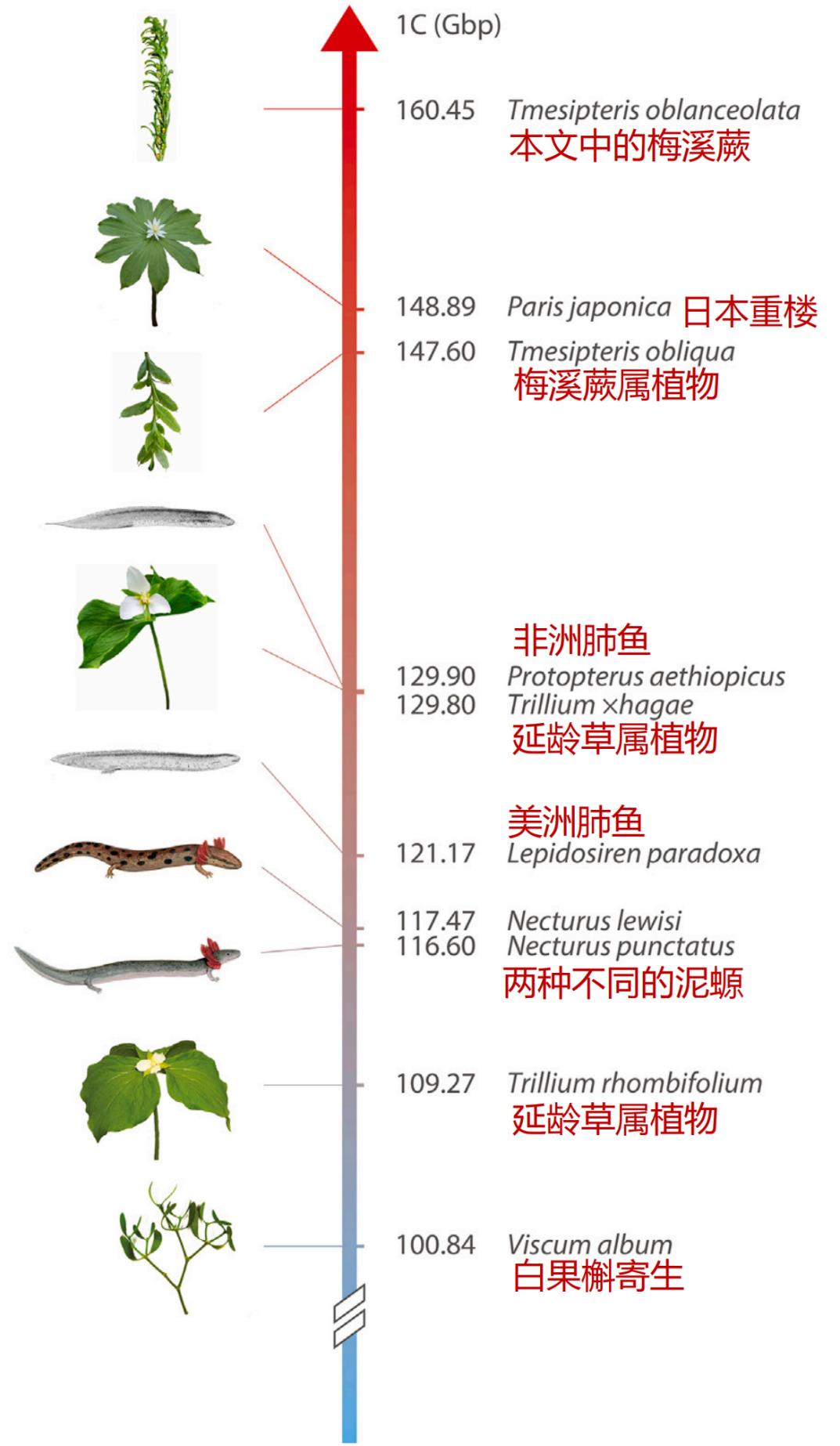 這一稱號實至名歸,因爲梅溪蕨的基因組大小達到了驚人的160.45 Gb!它同時打破了三項世界紀錄——“最大的蕨類植物基因組”、“最大的植物基因組”和“最大的基因組”。此前,後兩項紀錄一直由基因組大小爲148.89 Gb的日本重樓(Paris japonica)自2010年起保持着。