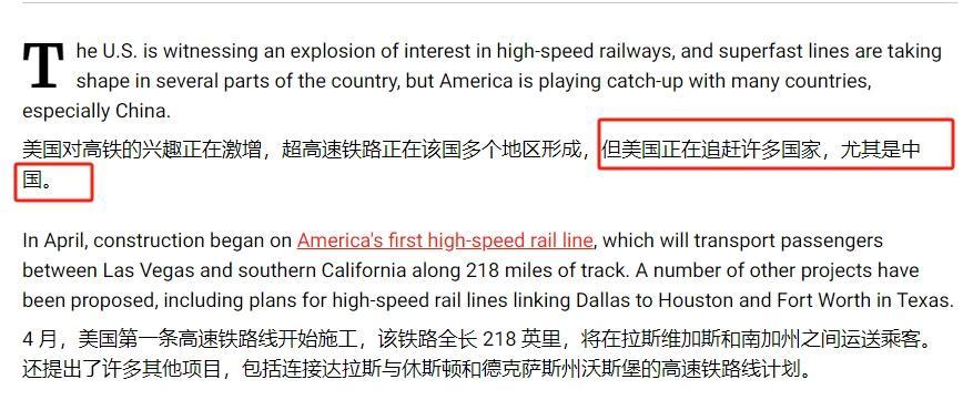 但是,美國也表示,雖然高鐵項目開工,但是跟中國相比,美國高鐵仍舊“微不足道”,還處於非常早期的階段,很多項目尚未獲得最終審批,一些關鍵信息也不清楚,比如達拉斯-休斯頓線,10年前就說修,現在還沒動靜,前陣子又說要用日本新幹線技術。