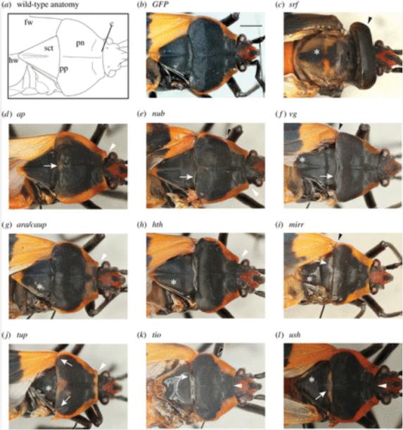 Jockusch團隊對昆蟲半翅目乳草長蝽(Oncopeltus fasciatus)研究發現,促使翅發育的基因在昆蟲體壁的各種突起中表達,胸部結構尤爲明顯。因此認爲,翅很可能是昆蟲身體邊緣突起基因過量的表達而形成。