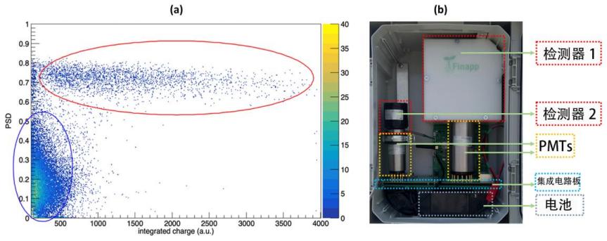 (a)捕獲的中子在閃爍體中激發顯著的脈衝電信號(紅色橢圓)。藍色橢圓爲μ子。(b)捕捉中子的核心部件:基於閃爍體的傳感器。檢測器1中含鋰6-氟化物,檢測器2爲閃爍器。PMTs爲光電倍增管。
