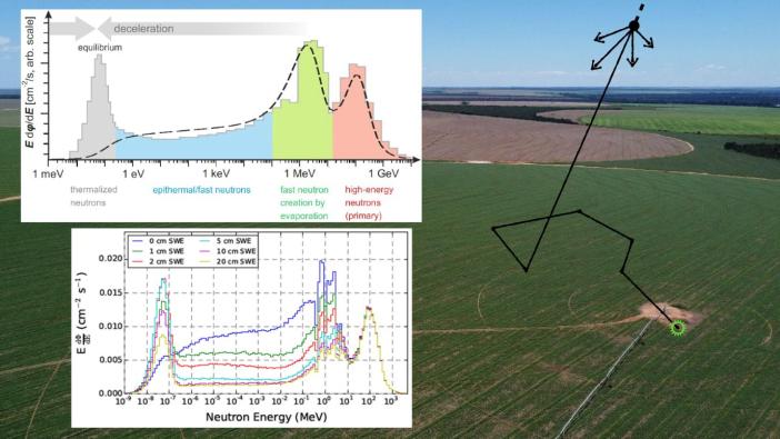 宇宙射線在田間反射,最終被檢測器捕捉。 左圖爲中子能量頻譜 (圖片來源:謝菲爾德大學)