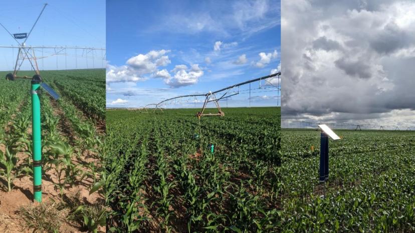 安裝在試驗田中的柱形宇宙射線探測器(左、右); 中央支點灌溉系統(中) (圖片來源:謝菲爾德大學)