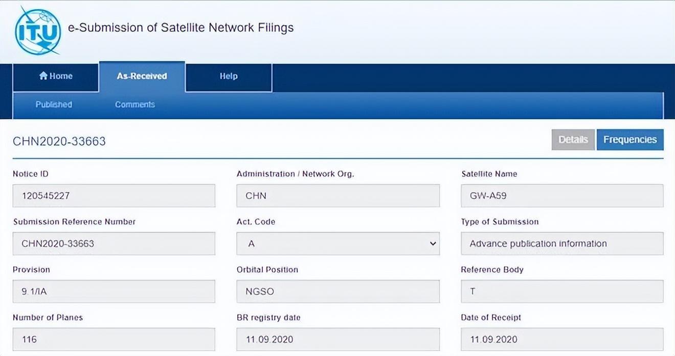 根據國際電信聯盟顯示,中國最早申請的星座項目是:GW星座,計劃12992顆衛星,分爲2個子星座,在500km以下的極低軌道部署6080顆衛星,在1145km的近地軌道部署6912顆衛星,由國家隊來主導。