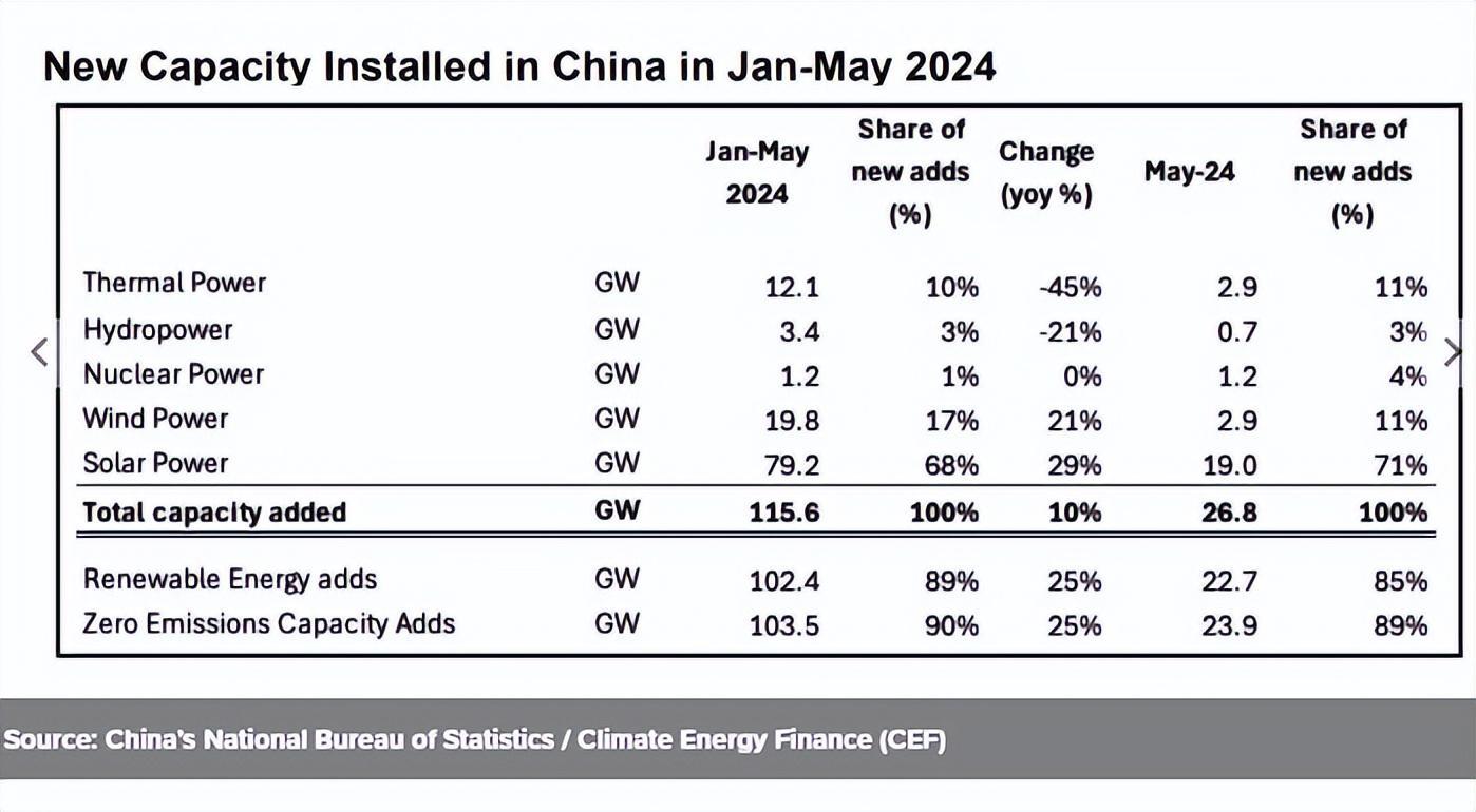其中太陽能新增裝機容量達79.2吉瓦,佔新增總量的68%。風能新增19.8吉瓦,佔比17%,比去年同期都有顯著增長,而火電新增裝機容量卻同比下降 45%。這意味着中國正在向更清潔的替代能源轉型,同時仍能滿足電網日益增長的需求。