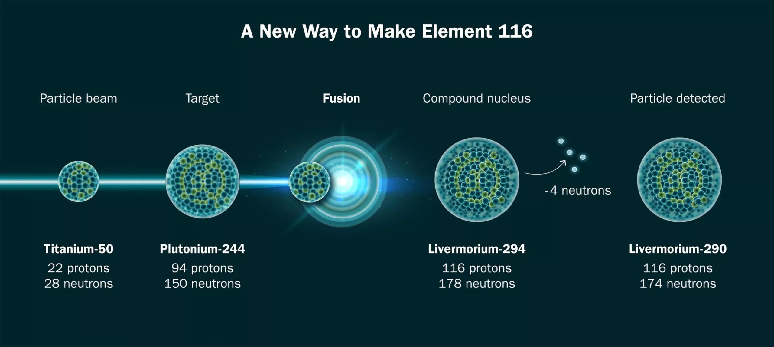 而鐦的質子數是98,這意味着要生產比118號更重的元素,就需要比鈣(20個質子)更重的粒子束,鈦(22個質子)粒子束也因此進入了科學家們的視野。然而更重的粒子更難控制,並且實操經驗也很少,因此伯克利實驗室選擇先用它來合成更容易的116號,以驗證鈦粒子束合成重元素的可行性。