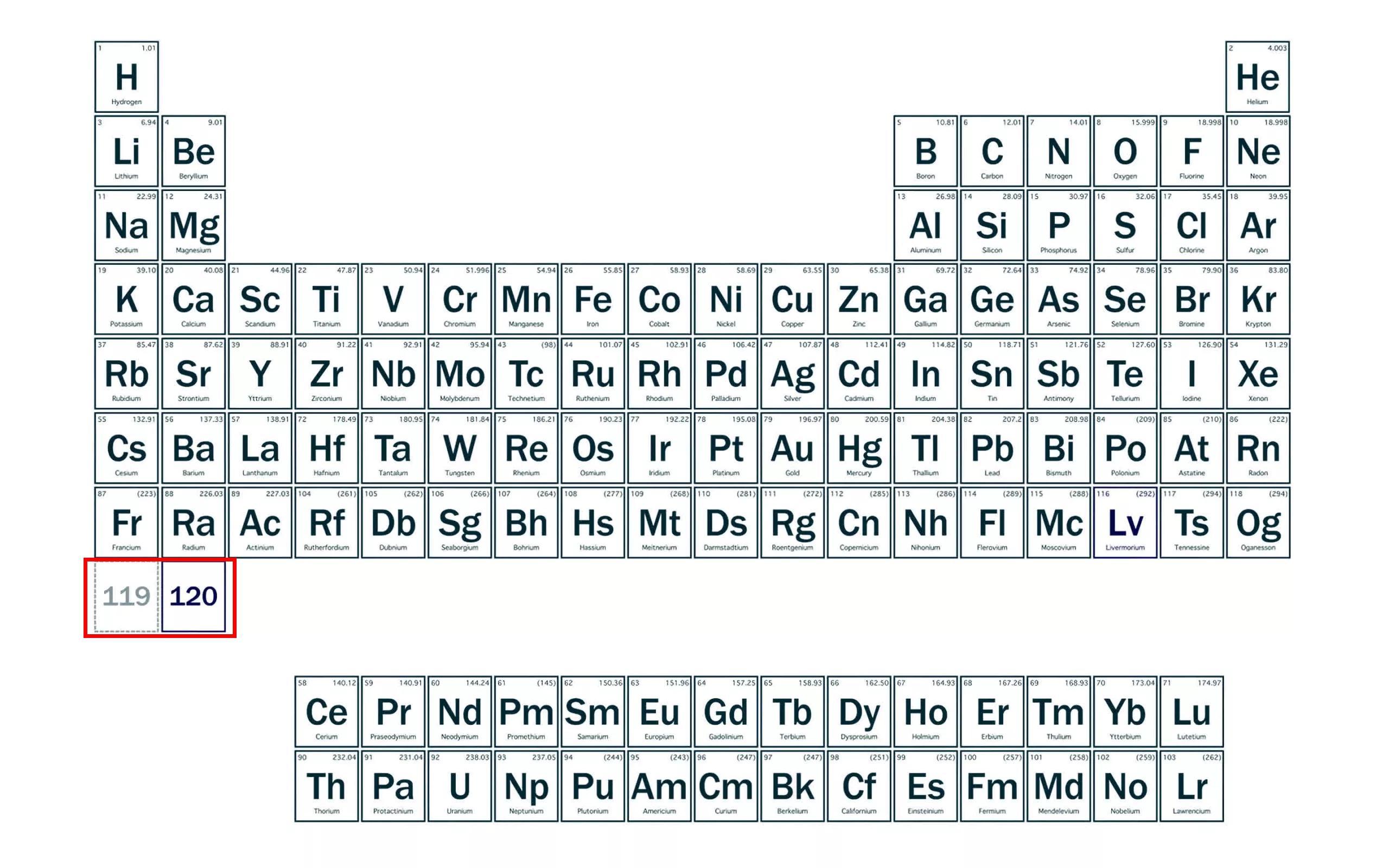 如果能夠發現第120號元素,這將是一個歷史性的時刻。目前元素週期表共有7行118個元素,120號元素將成爲有史以來最重的原子,並且位於新的第八行,而且它位於理論上的“穩定島”,有可能衰變時間更長,有潛力進行更深入的研究。