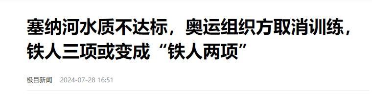 果然,7月28日,巴黎奧組委和國際鐵人三項聯合會發表聲明說,塞納河水質不達標,原定於28日的賽前訓練被迫取消,而且還認爲,塞納河水質不足以保證賽事的舉辦,這意味着鐵人三項可能要變成鐵人兩項了。