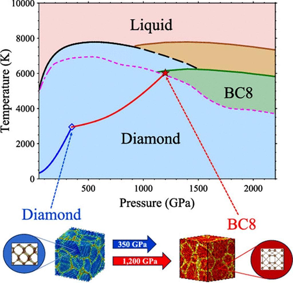 要形成BC8的超強結構,需要將普通鑽石熔化才能重新排列成BC8的晶相,並且需要比預期更大的壓力,也就是1200萬個大氣壓,以及5000K的高溫。