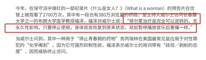 比如:布朗大學醫學教授福澤,在採訪中表示,荷爾蒙治療是完全可以逆轉的、無永久性影響,只要停止使用,身體就會恢復到原來狀態。但實際上,很多變性的人都後悔了,但是爲時晚矣。而且就算沒後悔,長期服藥也導致身體變差,患有多種疾病。