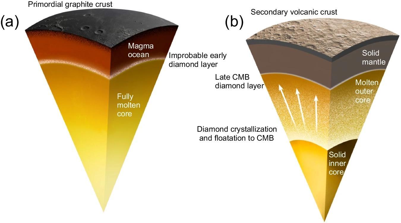 這項研究來自北京高壓科學研究中心和比利時列日大學。水星是太陽系密度僅次於地球的行星,一個巨大的金屬內核就佔了整個星球85%的半徑。水星表面非常暗,這是因爲它富含碳,以石墨的形式存在,然後還含有硫,可以降低混合物的熔點,研究人員因而猜測,在水星形成初期,進入水星地下的碳會不會在高壓下成爲鑽石呢?