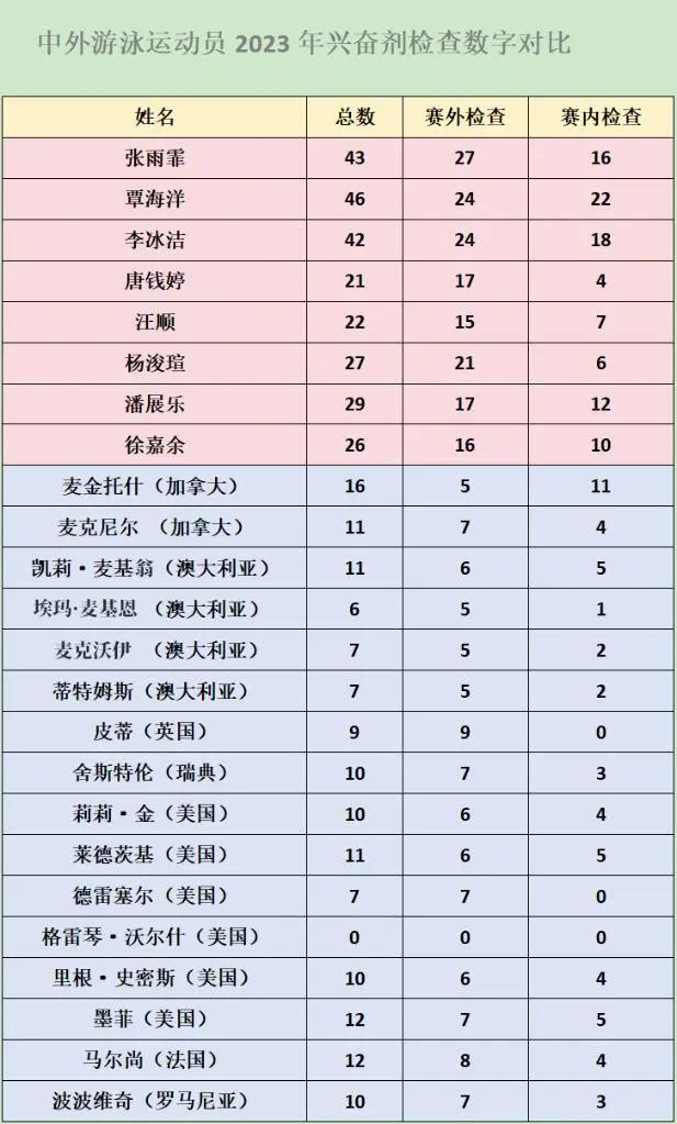 根據世界泳聯公佈的2023年興奮劑檢查數據,中國運動員接受的興奮劑檢查最頻繁,而且還不是一般的多,而且還不是多一兩次,而是多了好1、2倍。