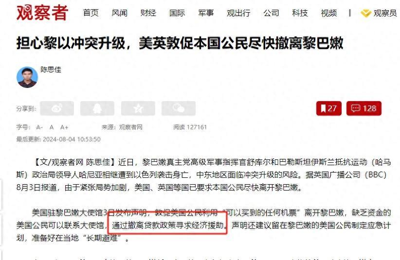 不過美國撤僑的方式挺有意思的,他們要公民“借貸撤僑”。美國駐貝魯特大使館表示,仍在黎巴嫩的美國人,馬上買任何離開黎巴嫩的機票,不管它什麼時候起飛,不管什麼目的地,儘快離開黎巴嫩。但如果你沒錢,也沒關係,你可以聯繫大使館,大使館會給你提供貸款。