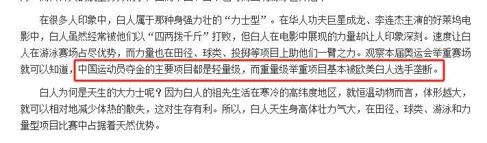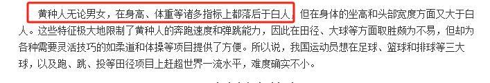 還有中文媒體說,亞洲人不適合激烈對抗的體育運動。還說:黃種人無論男女、在身高、體重等諸多指標上都落後白人。