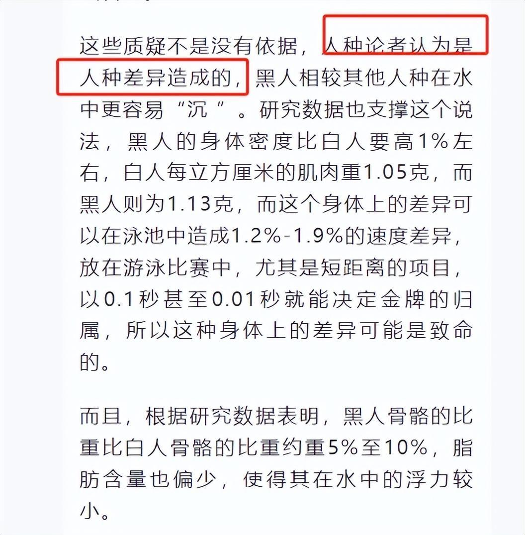 其實我不想把體育跟政治掛鉤,但是西方國家就是這麼做的,用體育來宣傳白人種族優越論,甚至連中文媒體,都充斥着:白人更適合游泳。