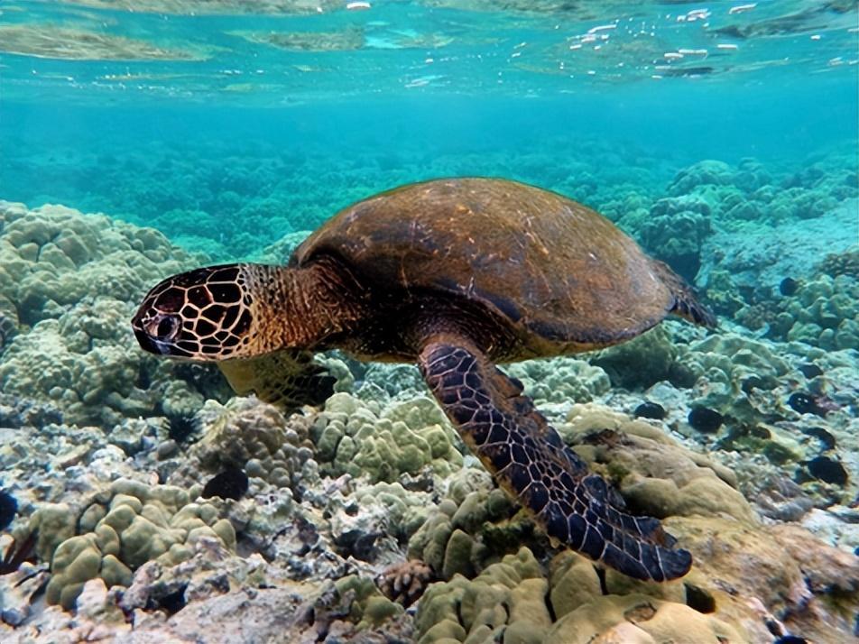 那麼,綠海龜到底是哪裏“綠”?原來,成年綠海龜以海藻和海草爲主食,這些“素菜”中的葉綠素將它們的脂肪染成綠色,由此得名“綠海龜”。