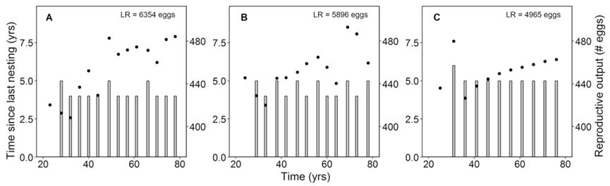海洋熱浪每(a)20年;(b)10年;(c)5年發生一次時寧加洛礁雌性綠海龜繁殖產量的變化(黑點表示每個繁殖季節的產卵數,LR爲終身產卵數)