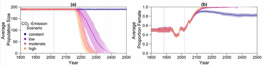 高排放情景下,到本世紀中期,築巢區的雄性比例先達到峯值,佔比可能達到85%,但隨着溫度繼續升高並超過第二個中樞溫度,本世紀末時這個比例又會下降到6%以下。