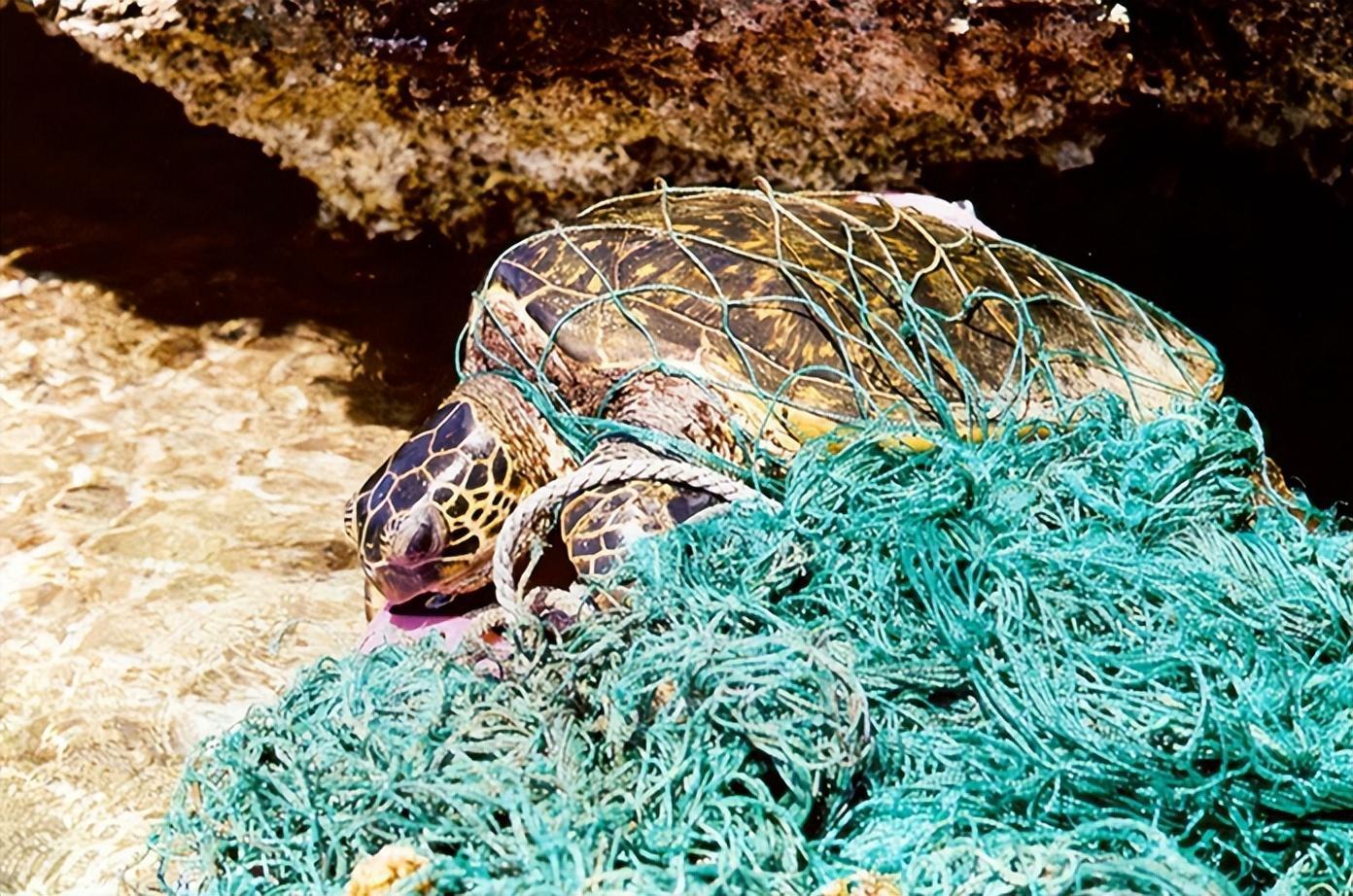 被漁網纏住無法脫身的綠海龜(圖片來源:NOAA)