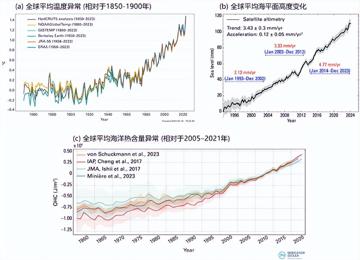 全球年平均 (a) 溫度異常, (b) 海平面高度變化, 及 (c) 海洋熱含量異常 (圖片來源:參考資料[7])