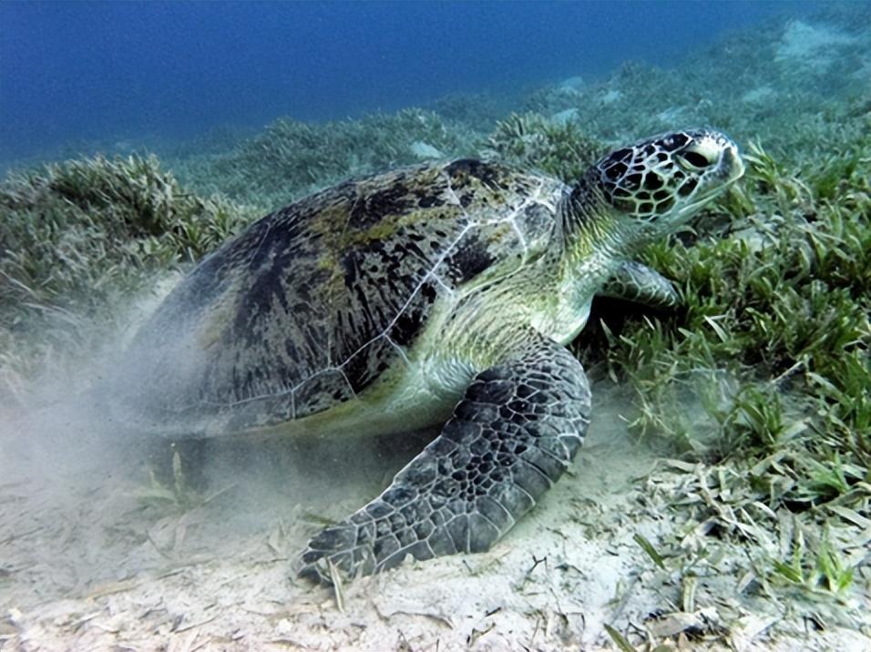 要知道,一隻成年綠海龜的體長能有1.5米,體重68-190公斤,已知最大的綠海龜更是重達395公斤。如此龐然大物,居然是喫素的!當然,它們也不是生來就只喫草,幼龜會攝食魚卵、軟體動物和甲殼類以獲取成長所需的營養。