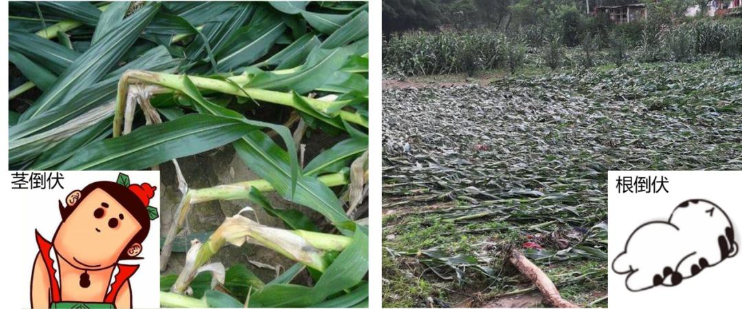 倒伏的兩種類型,左圖爲莖倒伏,右圖爲根倒伏