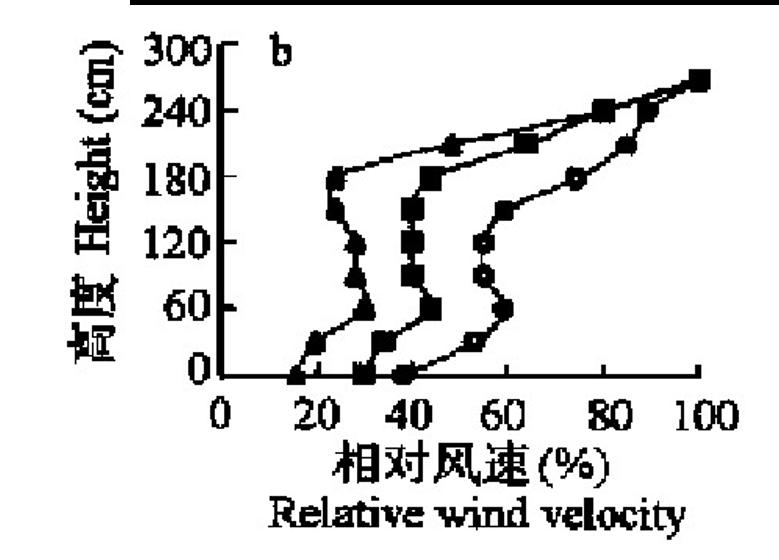 玉米羣體內風速的垂直分佈(劉開昌等,2000)