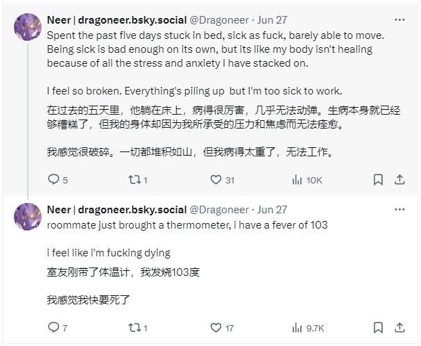 29日,情況依舊沒有好轉,網友勸他去看病,但他表示,去年看了牙醫,現在還在還牙醫賬單,不想再揹負任何醫療債務了。