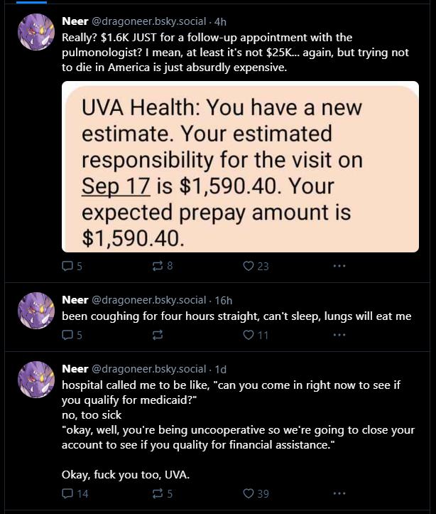 到了這一步他已經沒錢了,那你可能會說,美國都有醫療保險,報銷後個人承擔不了多少,這是個好問題,但是他沒有保險,因爲他買不起。爲啥買不起呢,因爲保險公司拒絕了他。那怎麼不申請醫療救助,又是一個好問題,需要他本人親自去醫院,而此時他已經連站都站不起來了,醫生說,好吧,鑑於你不配合,那就只好把你得賬戶關了。而且就算他申請了,也不一定能成功。