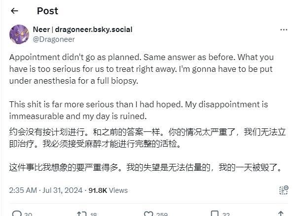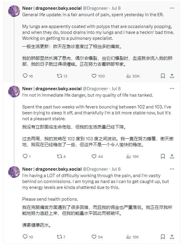 7月8日,他實在扛不住了,終於去了醫院急診。他表示過去2周,體溫一直在38.8-39.4℃之間波動,雖然沒有生命危險,但是生活質量很糟糕。網友也很支持他,說你可以開通籌款,不要擔心賬單,這不是你現在需要考慮的事情。