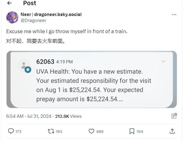 這次去急診,終於做了檢查,查出肺部有問題,雖然沒給什麼有建設性的醫療建議,但是他又收到了5168.96美元的賬單。