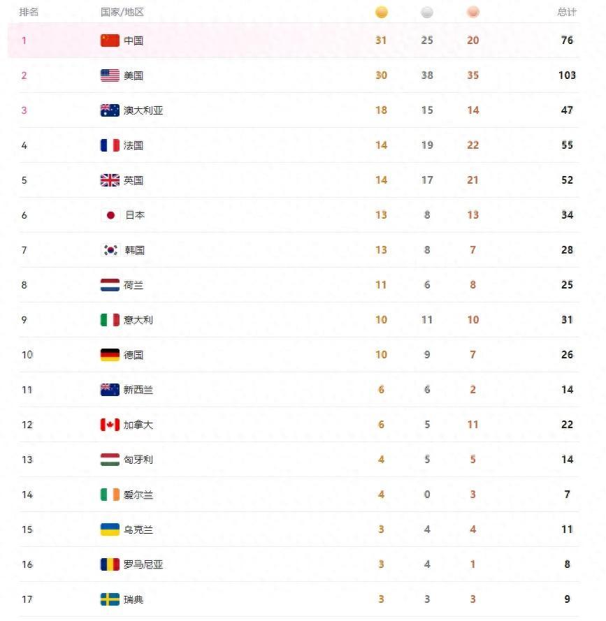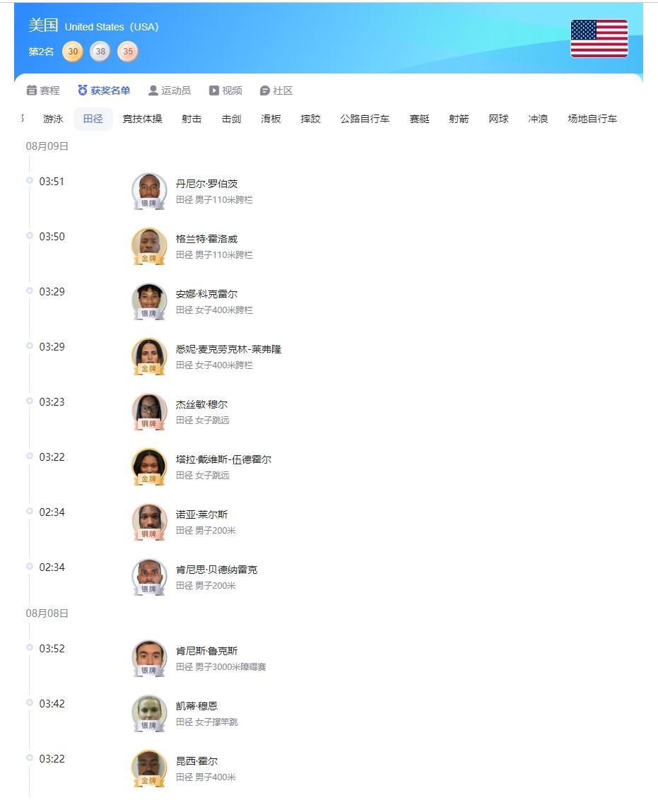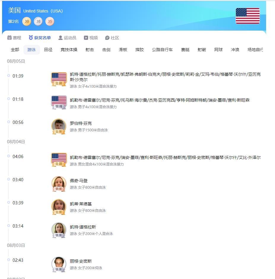 你看,美國的這30塊金牌,都是哪些賽事:田徑9塊金牌,游泳8塊,這就17塊了,佔了30塊金牌的一大半。而且游泳田徑還沒比完,美國還有很多奪金點。