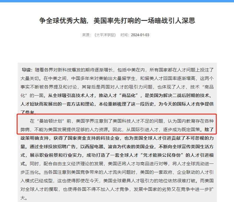 美國社會學家在他的書《美國科學在衰落嗎》寫道,美國之所以沒有衰落,是因爲美國雖然沒有培養出足夠數量的科學家和工程師,但是美國可以吸引全世界最優秀的人才,比如:20多年來,中國一直是美國科學家最重要的外國供應商。
