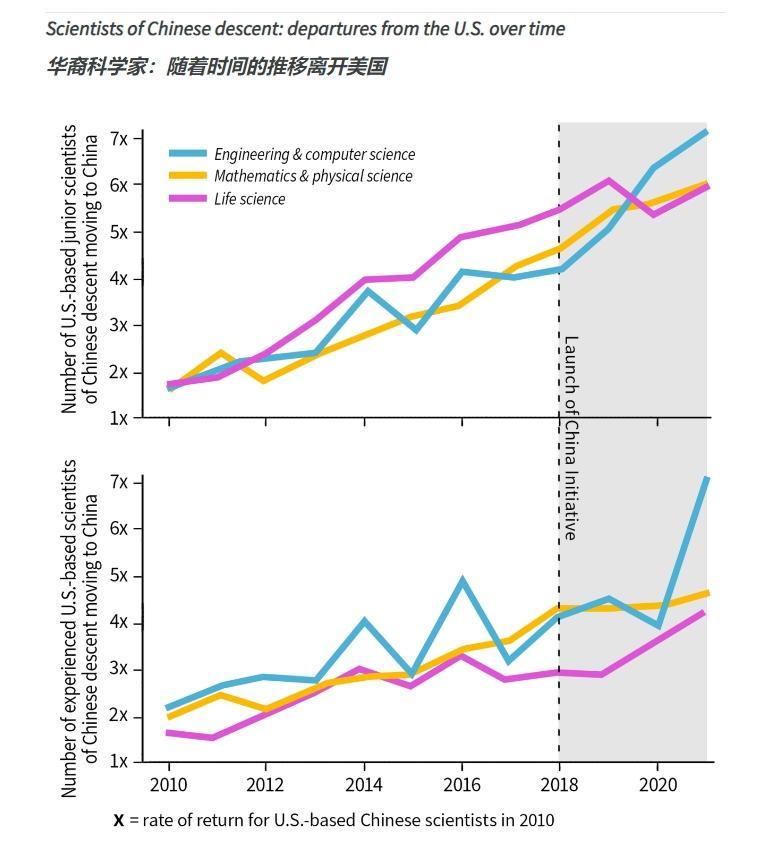 斯坦福報告指出,華裔科學家正在加速離開美國,2/3回到中國。過去每年從美國向外遷移的華裔科學家,每年大約是900人,但是2020年之後猛增到了每年2600多人,主要原因就是特朗普的一項臭名昭著的計劃“中國行動計劃”。