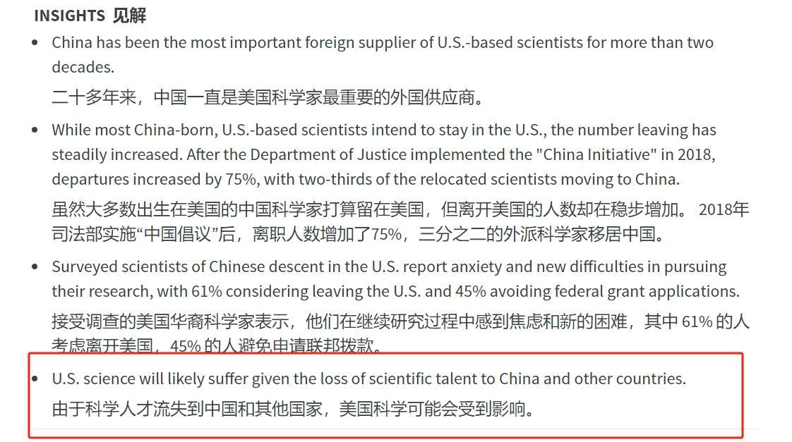 這也是有原因的,因爲中國從古到今都非常注重教育,但是過去中國比較窮,能提供的高薪崗位有限,有些人出國留學就留在美國了。但是現在,本身中國變強了,已經在吸引一部分華裔科學家回國了,而美國又搞排華政策,搞得華裔科學家工作不能開展,生活不能繼續,所以加速從美國流失。