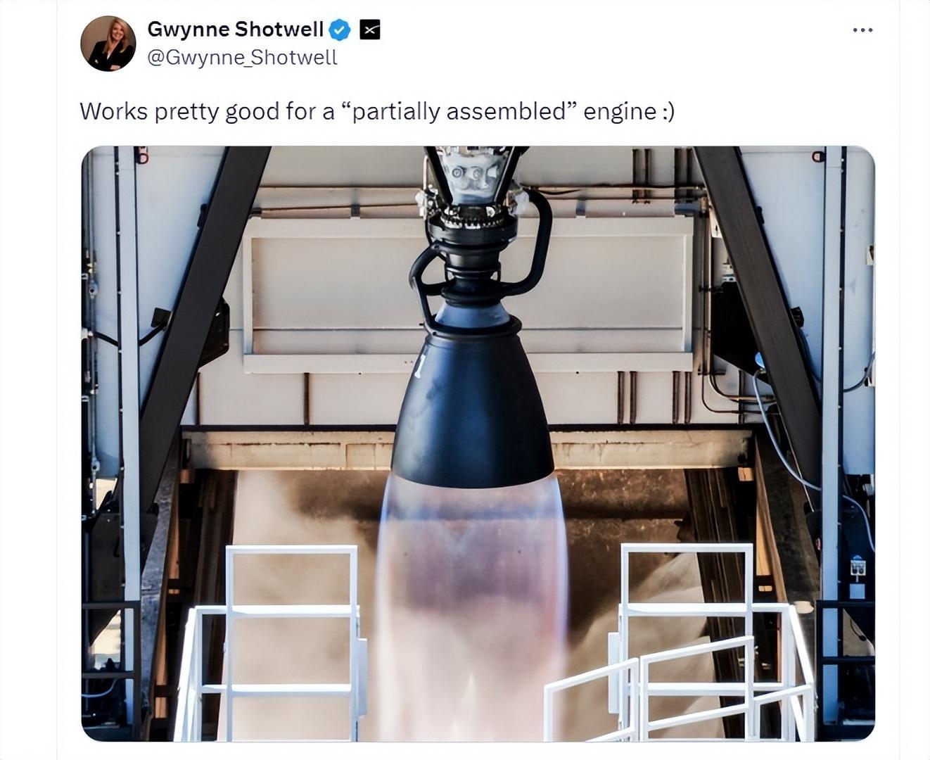 所以這個布魯諾絕對是真正的專家,美國航空界炙手可熱的人物,但這次他是真正看走眼了,SpaceX公司總裁格溫·肖特韋爾很快就發佈了一張猛禽3點火測試的照片,調侃說: