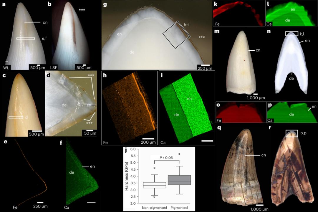 在這次研究中,科學家們發現了這類牙齒之前一直被忽視的一個特性:所有未磨損的牙齒的尖端以及鋸齒邊緣,都有橙黃色的色素沉積——即使是還未萌出的新牙也是如此。經過掃描透射電子顯微鏡(STEM)等高新科技的測試以後,他們發現這些橙黃色的色素沉積帶實際上是一層富含氧化鐵的條帶。這個條帶僅在未磨損的牙齒上發現,而且非常薄,厚度甚至小於1微米,但是在那些使用了很久的牙齒上,這一條帶大部分已經消失。