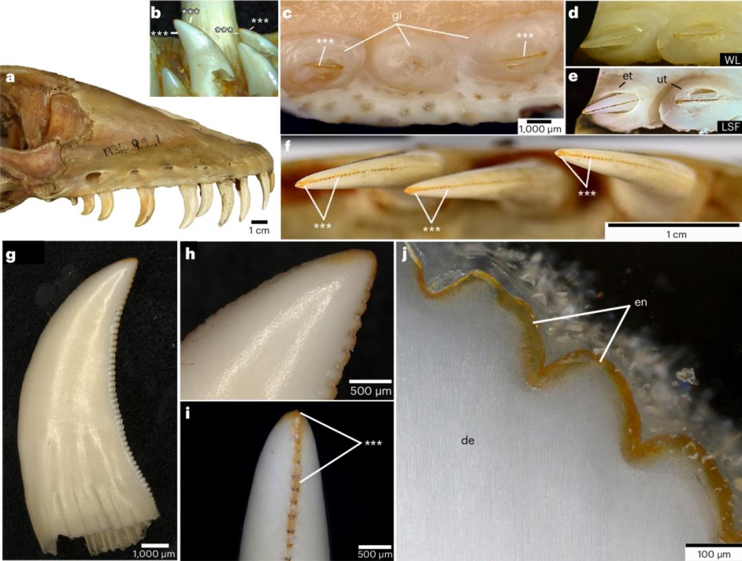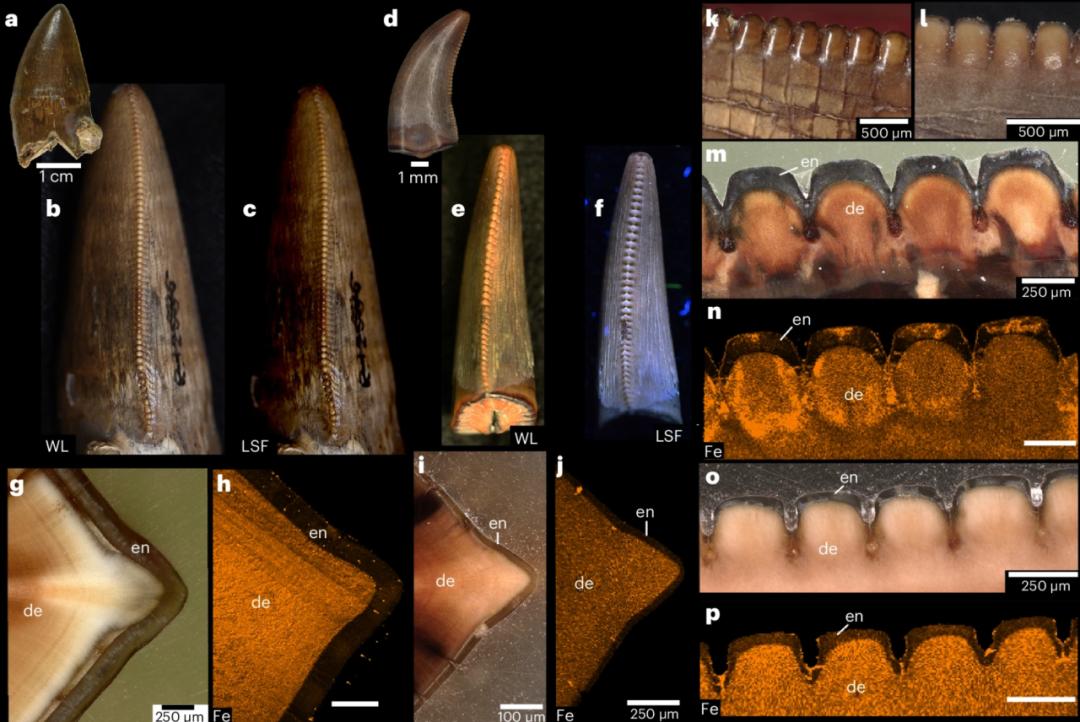 科學家們更進一步在鱷魚牙上也進行了觀察,雖然鱷魚牙齒並沒有細小的鋸齒,但是它們的牙齒呈現圓錐狀,圓錐上存在數條脊狀凸起,這些脊狀凸起也起到了類似刀刃的作用,有助於鱷魚切開獵物。在脊狀凸起上,科學家們也觀察到了一層富含鐵質的條帶。