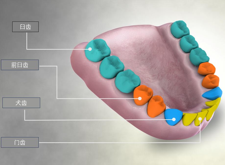 哺乳動物的牙一般分爲四種不同的形態:犬齒、門齒、前臼齒和臼齒,它們各自有不同的形態,也因此具備了不同的功能。比如犬齒是相對尖而長的牙齒,它們一般就是殺死獵物的武器以及撕裂食物的工具;門齒廣泛存在於雜食性動物和食草動物中,它們的形態是扁平的,起到了切斷植物莖稈、咬開果實外殼的作用;前臼齒帶有兩個尖齒,用於切割和研磨;臼齒則有多種形態,其平面上有不同的紋路,就像石磨一樣,主要用於磨碎食物。