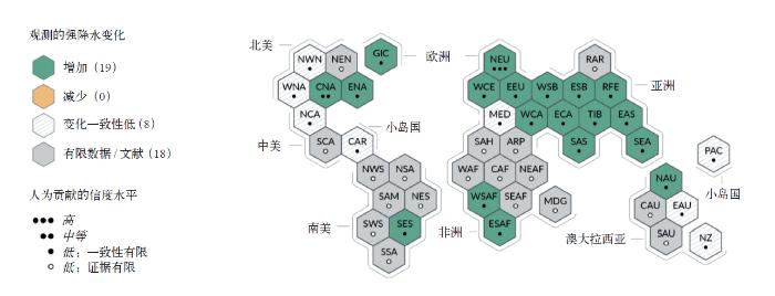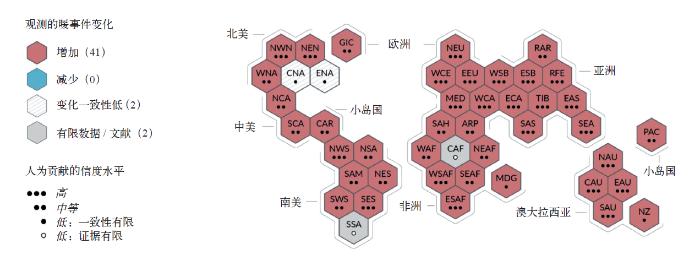 20世紀中葉以來極端熱事件的變化與歸因,分別是北美包括NWN(北美西部‒北部地區)、NEN(北美東部‒北部地區)、WNA(北美西部)、CNA(北美中部)、ENA(北美東部);中美包括NCA(中美北部)、SCA(中美南部)、CAR(加勒比海);南美包括NWS(南美西部‒北部地區)、NSA(南美北部)、NES(南美東部‒北部地區)、SAM(南美季風區)、SWS(南美西部‒南部地區)、SES(南美東部‒南部地區)、SSA(南美南部);歐洲包括GIC(格陵蘭/冰島)、NEU(歐洲北部)、WCE(歐洲中西部)、EEU(歐洲東部)、MED(地中海);非洲包括MED(地中海)、SAH(撒哈拉)、WAF(非洲西部)、CAF(非洲中部)、NEAF(非洲東部‒北部地區)、SEAF(非洲東部‒南部地區)、WSAF(非洲南部‒西部地區)、ESAF(非洲南部‒東部地區)、MDG(馬達加斯加);亞洲包括RAR(俄羅斯北極地區)、WSB(西西伯利亞)、ESB(東西伯利亞)、RFE(俄羅斯遠東地區)、WCA(中亞西部)、ECA(中亞東部)、TIB(青藏高原)、EAS(東亞)、ARP(阿拉伯半島)、SAS(南亞)、SEA(東南亞);澳大拉西亞包括NAU(澳大利亞北部)、CAU(澳大利亞中部)、EAU(澳大利亞東部)、SAU(澳大利亞南部)、NZ(新西蘭);小島國包括CAR(加勒比海)、PAC(太平洋小島國)。
