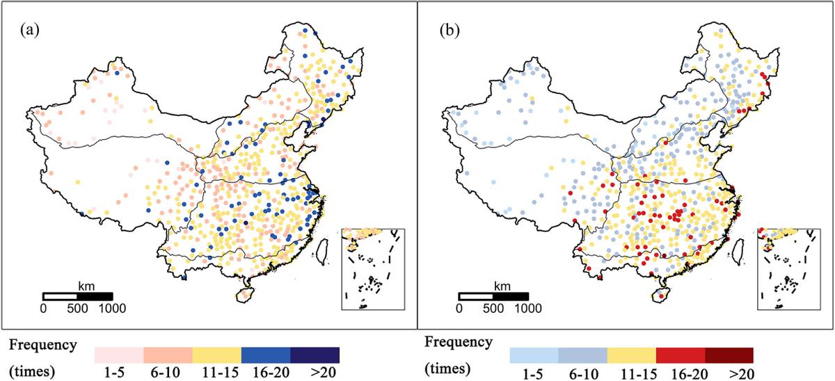 過去40年中國的旱澇急轉頻率分佈:(a) 旱轉澇事件和(b)澇轉旱事件 (圖片來源:參考文獻1)