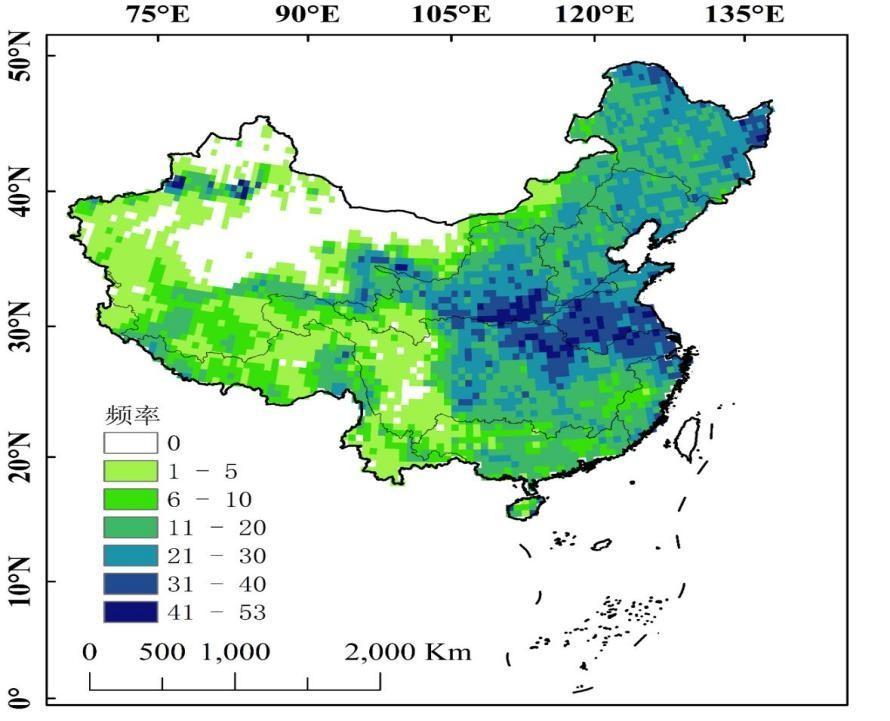 1961—2021 年旱澇急轉事件頻次空間分佈 (圖片來源:參考文獻2)