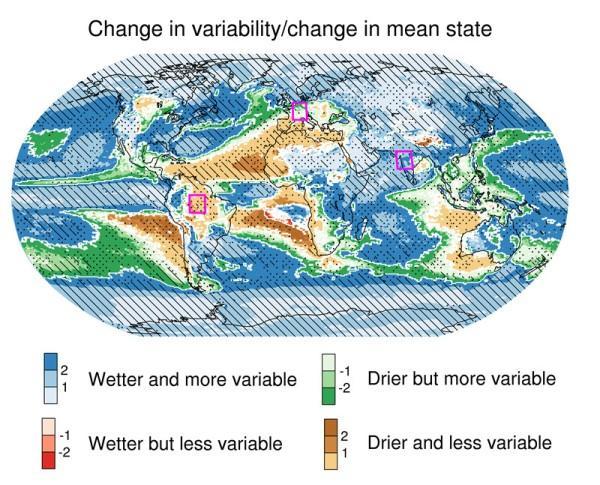 進一步的,全球溼潤區(主要包括熱帶、季風區、中高緯地區)因總降水增多而變得更溼潤的同時,降水在時間上的分配也將變得更不均勻,乾溼時期間的波動將更劇烈。