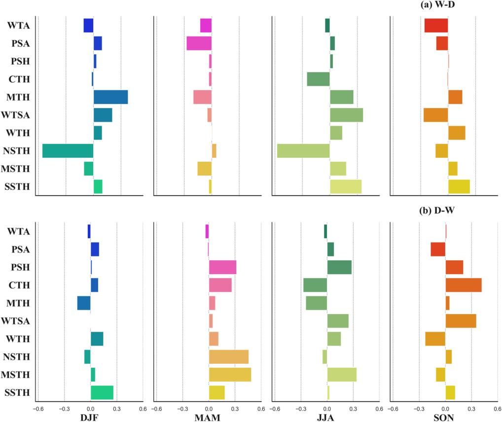 中國10個氣候區(a澇轉旱事件和(b) 旱轉澇事件在不同季節的面積加權平均值的預估變化。該值大於0表示預計旱澇急轉事件發生的頻率會增加,小於0表示預計DWAA事件發生的頻率會減少。